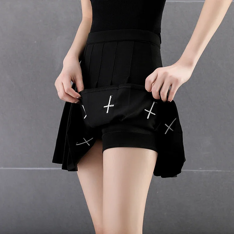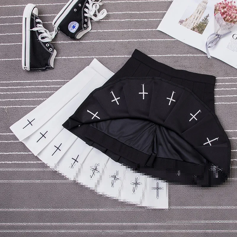 Harajuku Sweet Fresh Feeling High Waist Pleated Skirt Elastic Waist Cross Embroidery Skirt black skirt Pleated Skirt