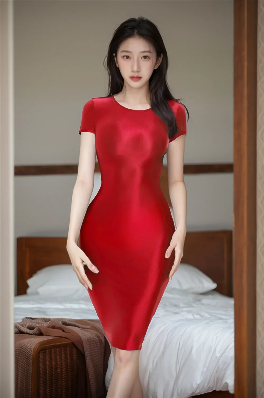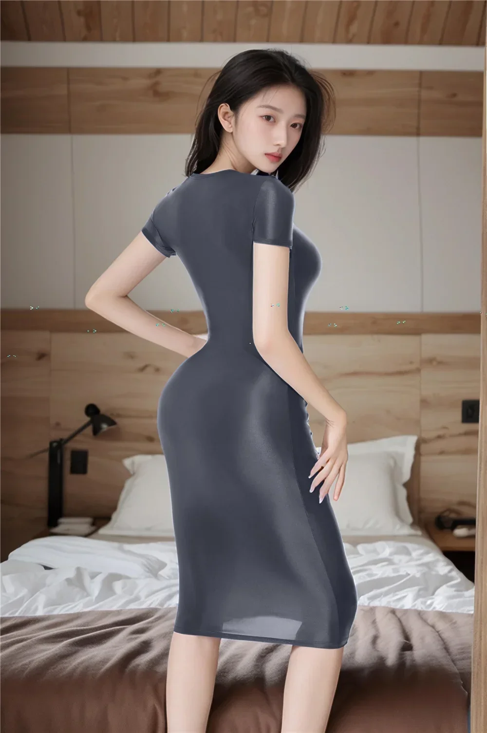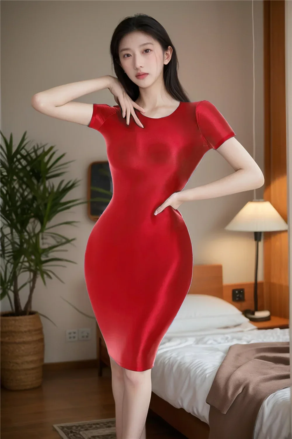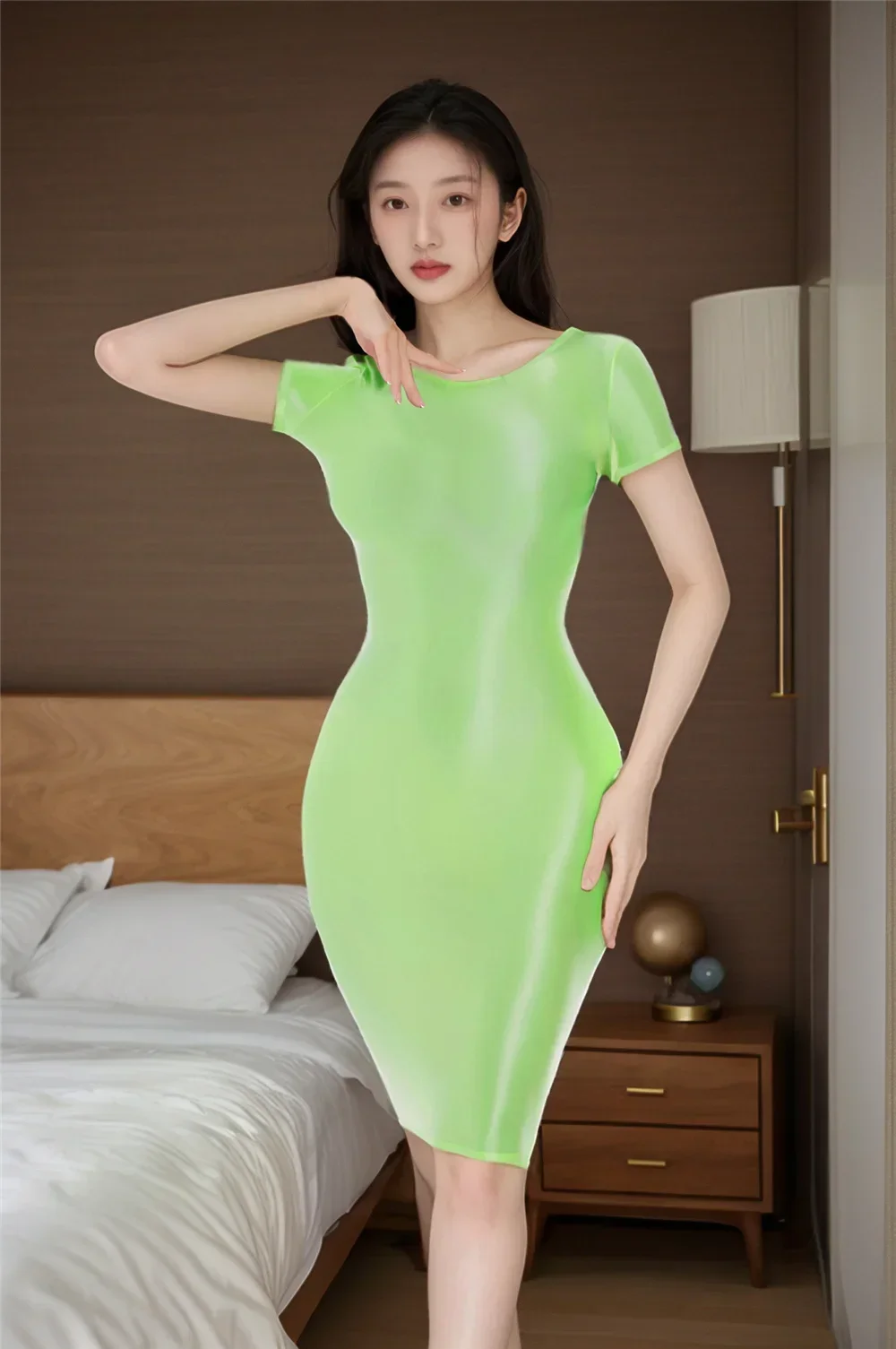 Sexy Women Sheer See Through Oil Glossy Micro Mini Dress Tight Packet Hip Step Dress Smooth Pencil Dress Candy Color