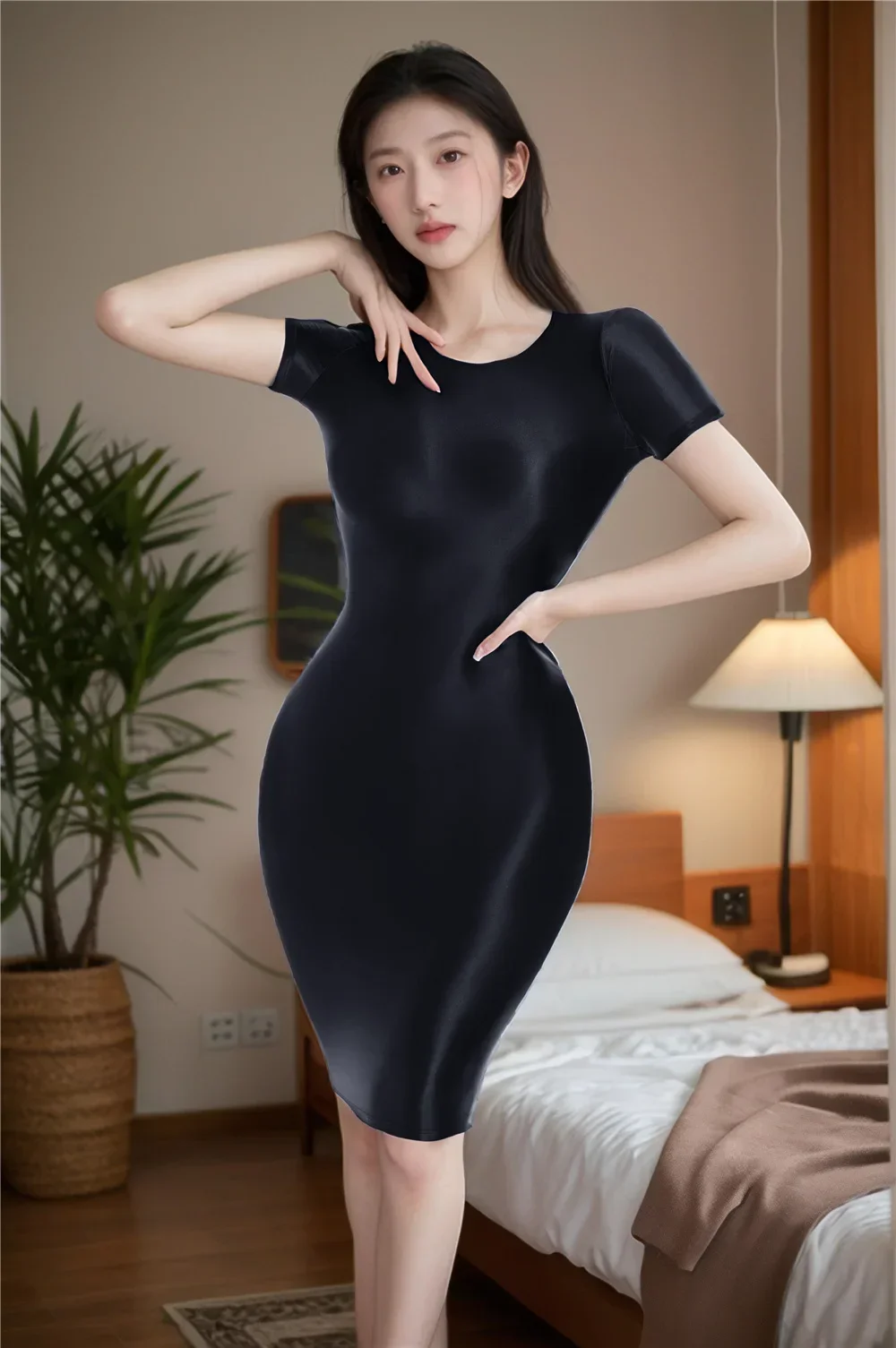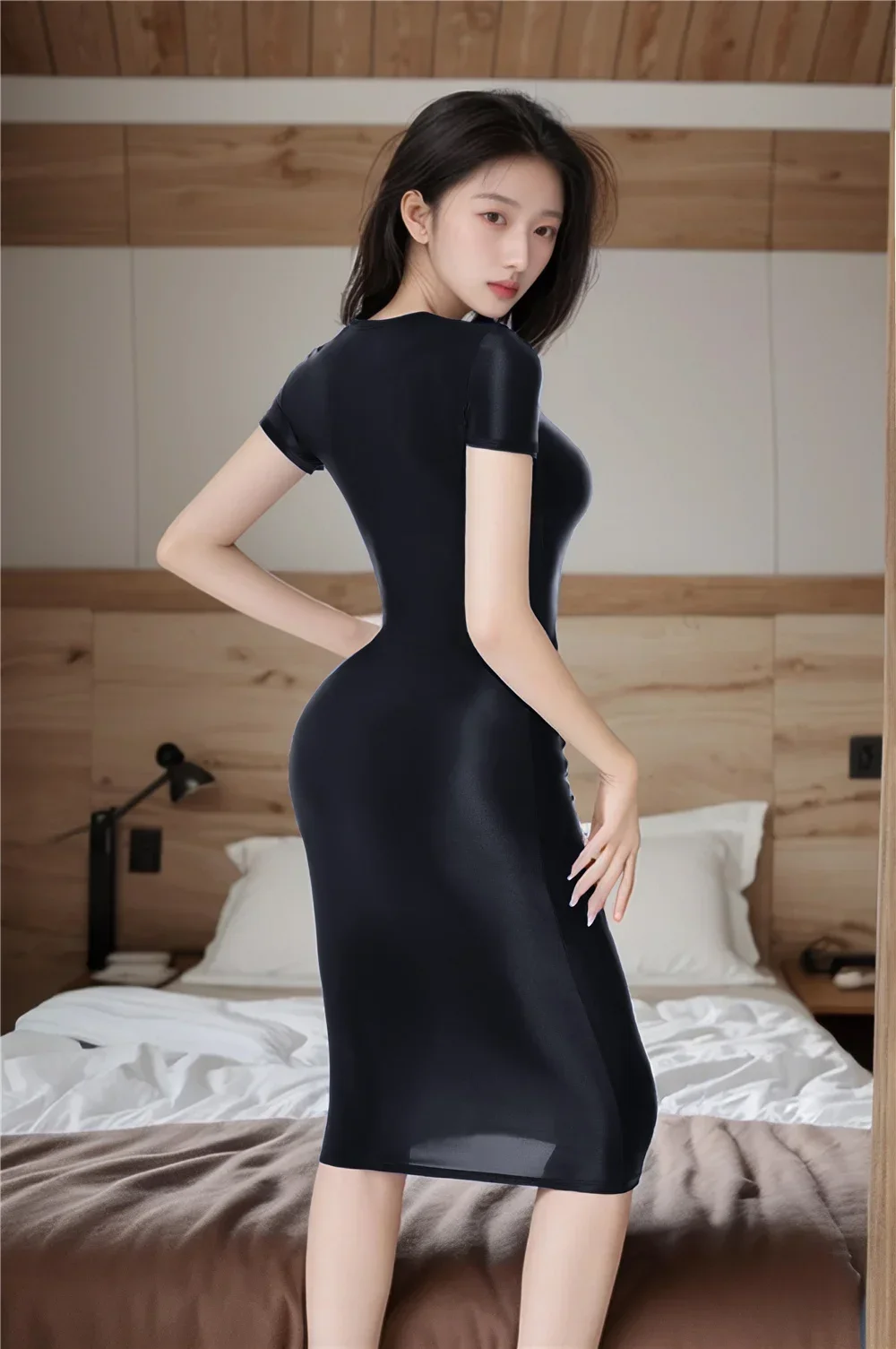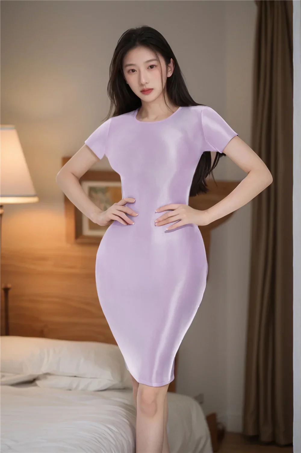 Sexy Women Sheer See Through Oil Glossy Micro Mini Dress Tight Packet Hip Step Dress Smooth Pencil Dress Candy Color