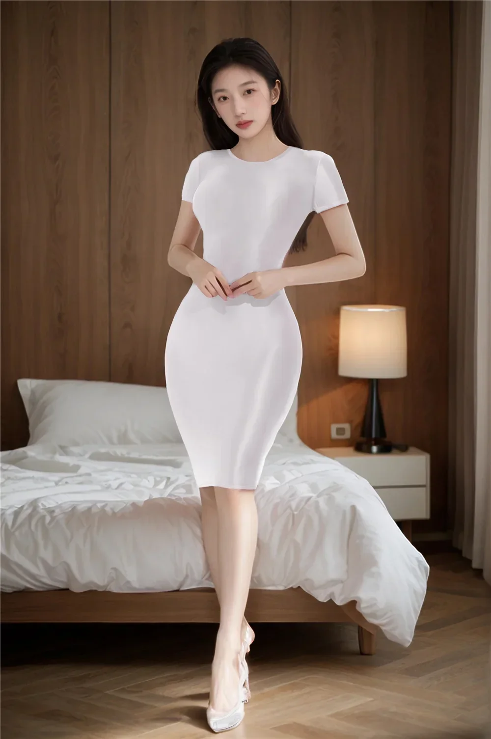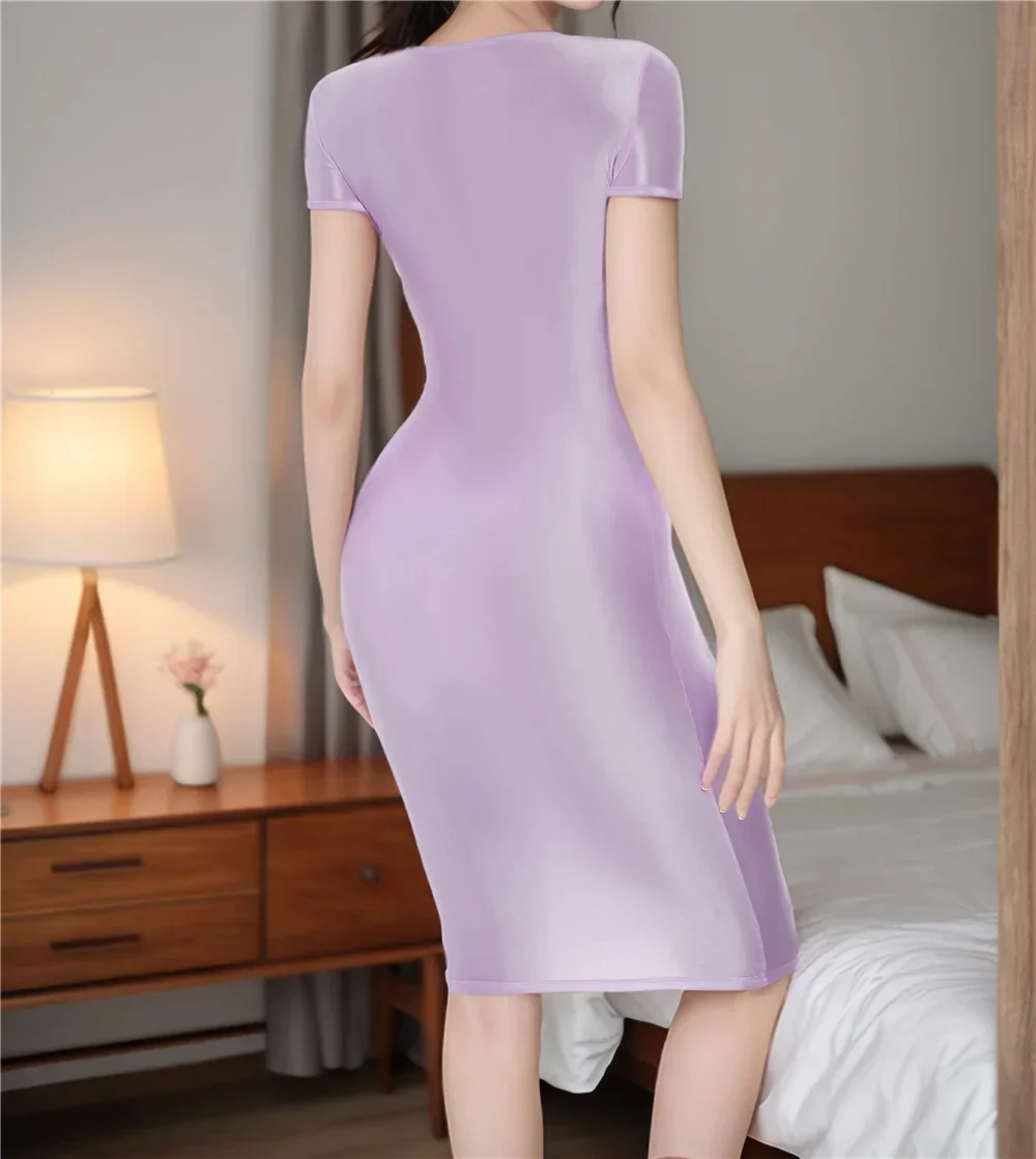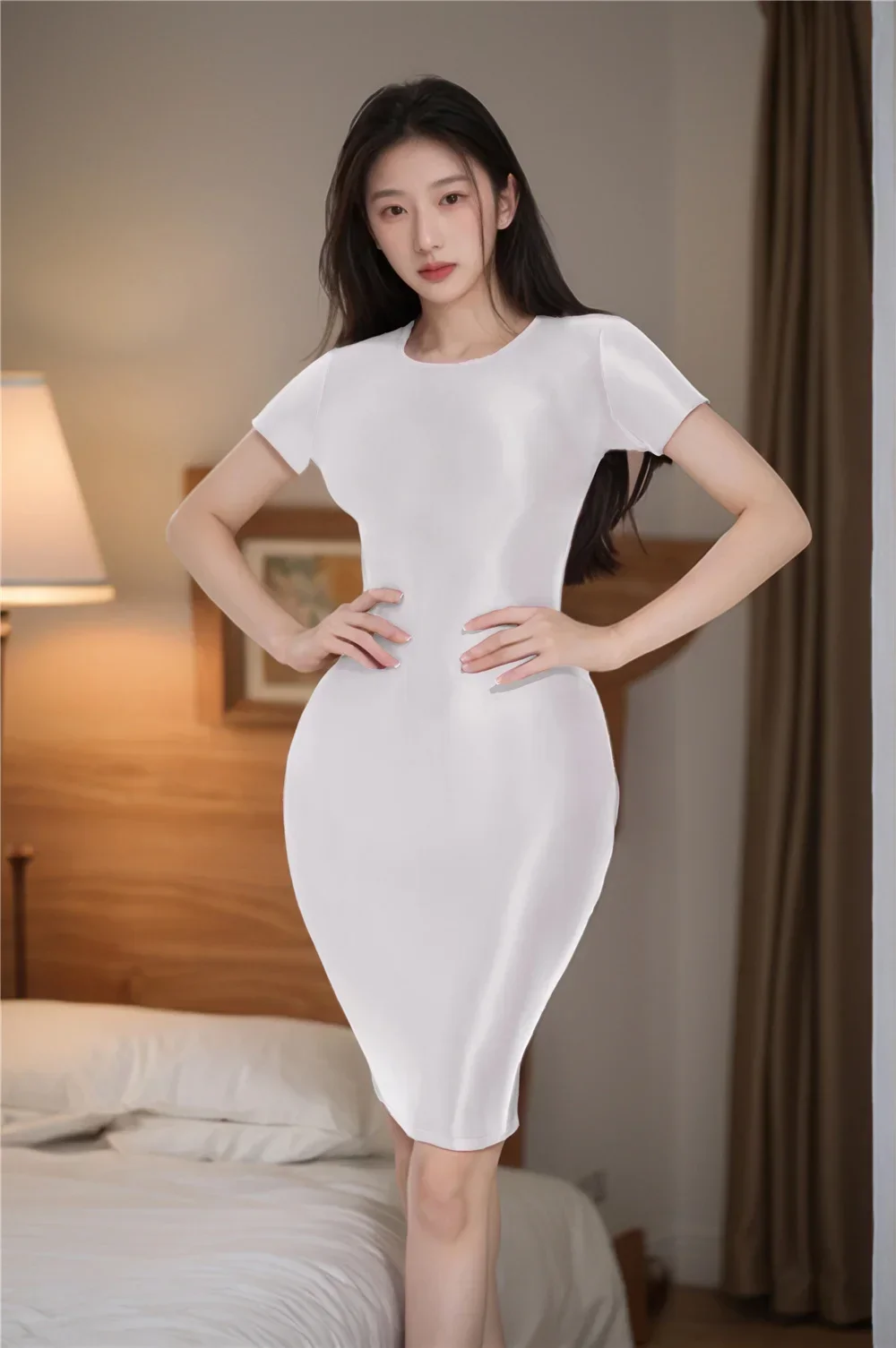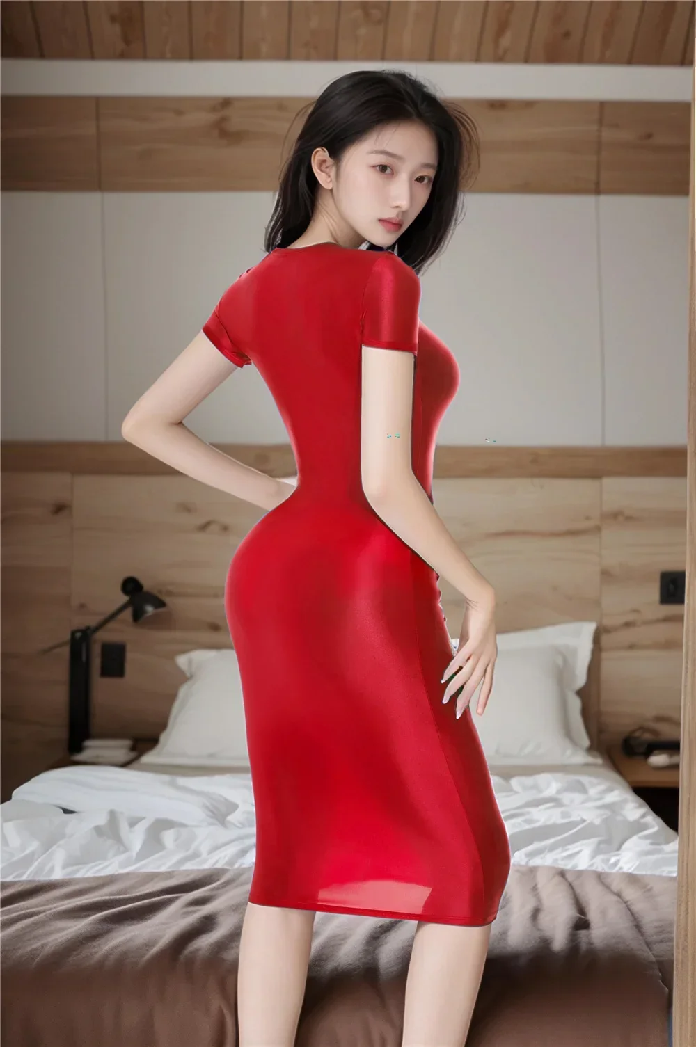 Sexy Women Sheer See Through Oil Glossy Micro Mini Dress Tight Packet Hip Step Dress Smooth Pencil Dress Candy Color